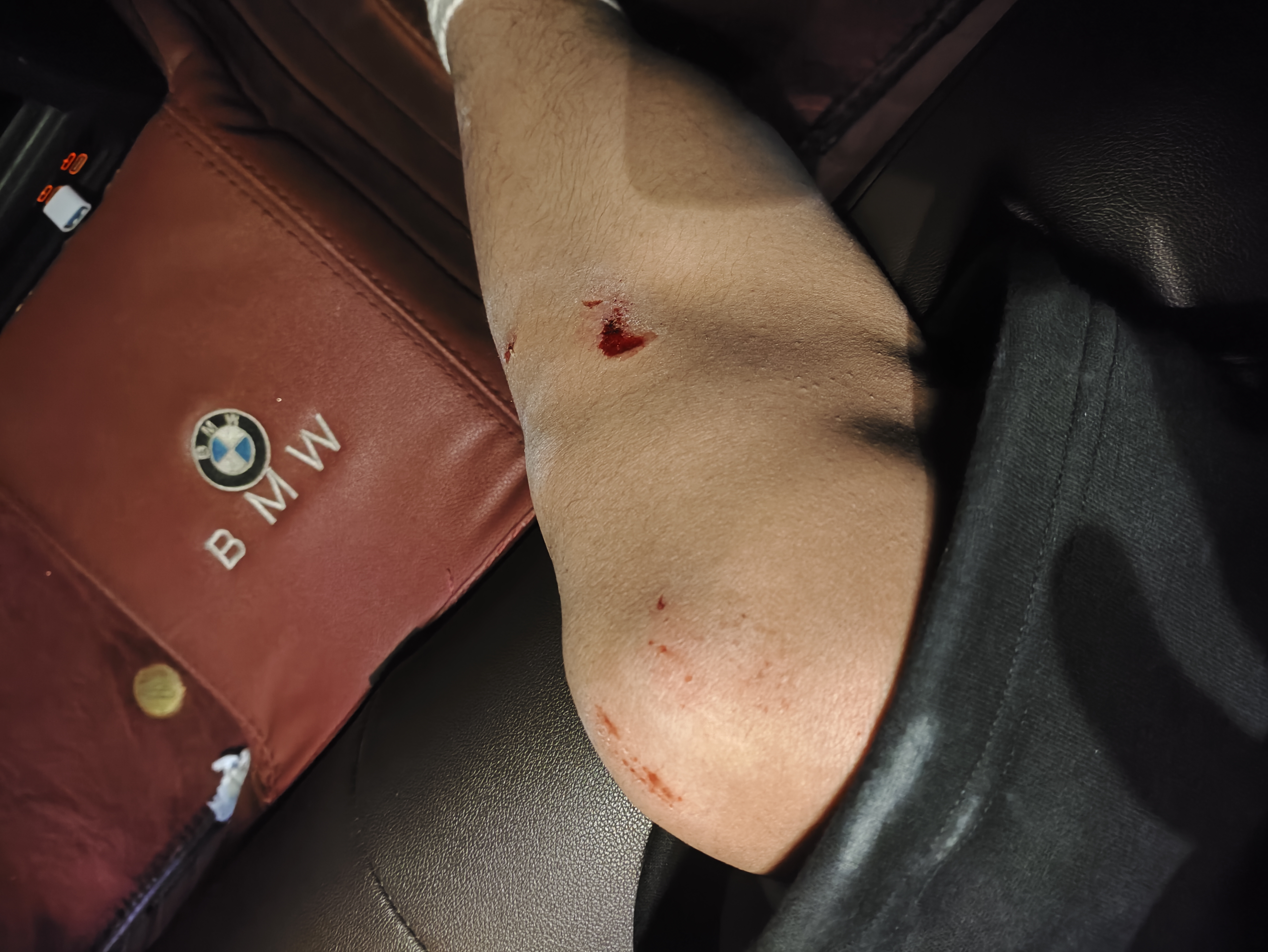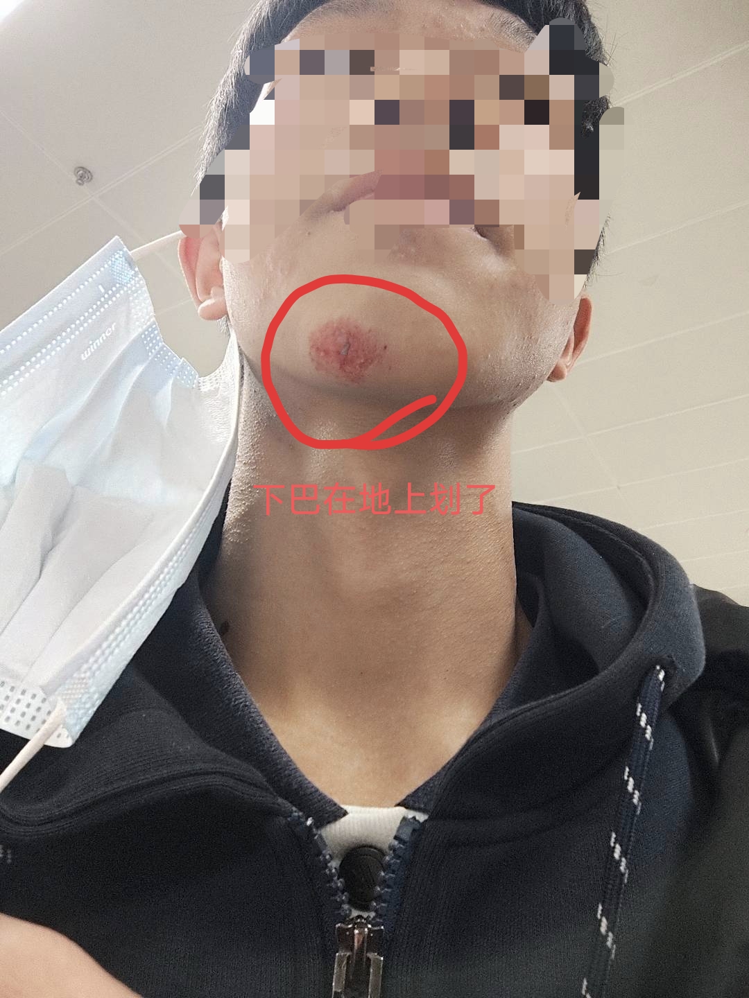 下巴流血 腿也是 左臂胀痛 膝盖痛